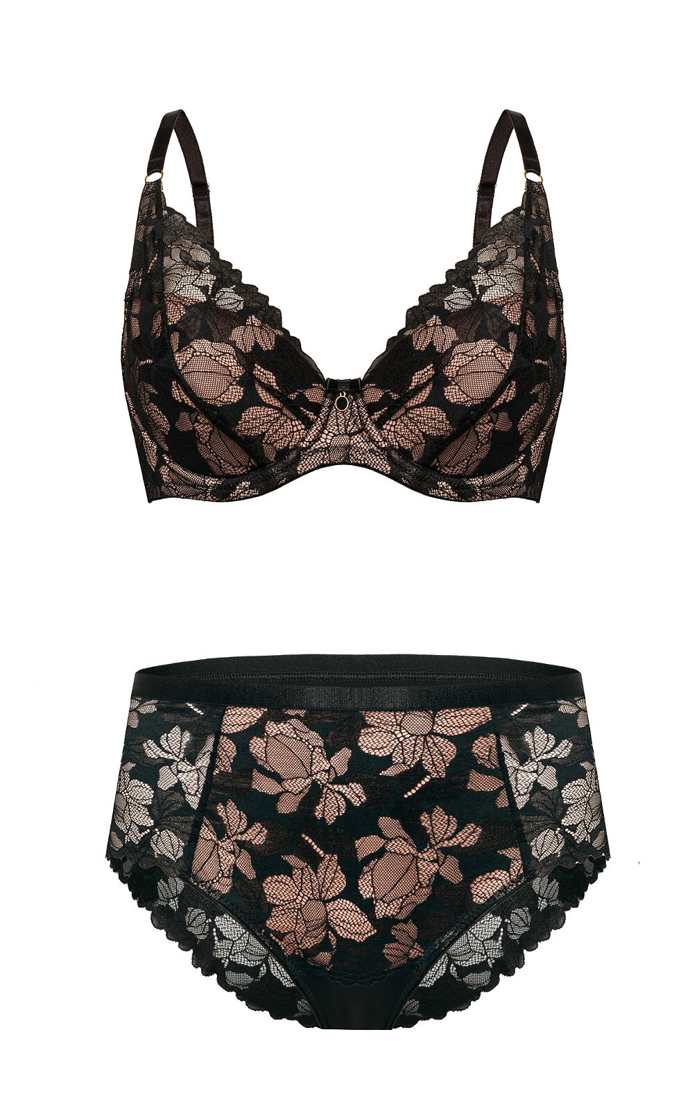 – z delikatnej kwiatowej koronki podszytej beżową siateczką