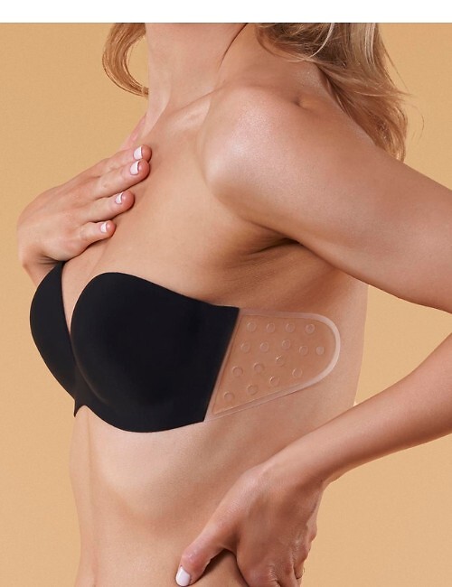 – Tai liemenėlė-bardotka su profiliuotais putplasčio kaušeliais, kurie puikiai laikysis ant krūtinės dėl sertifikuoto silikoninio lipnios dangos.
