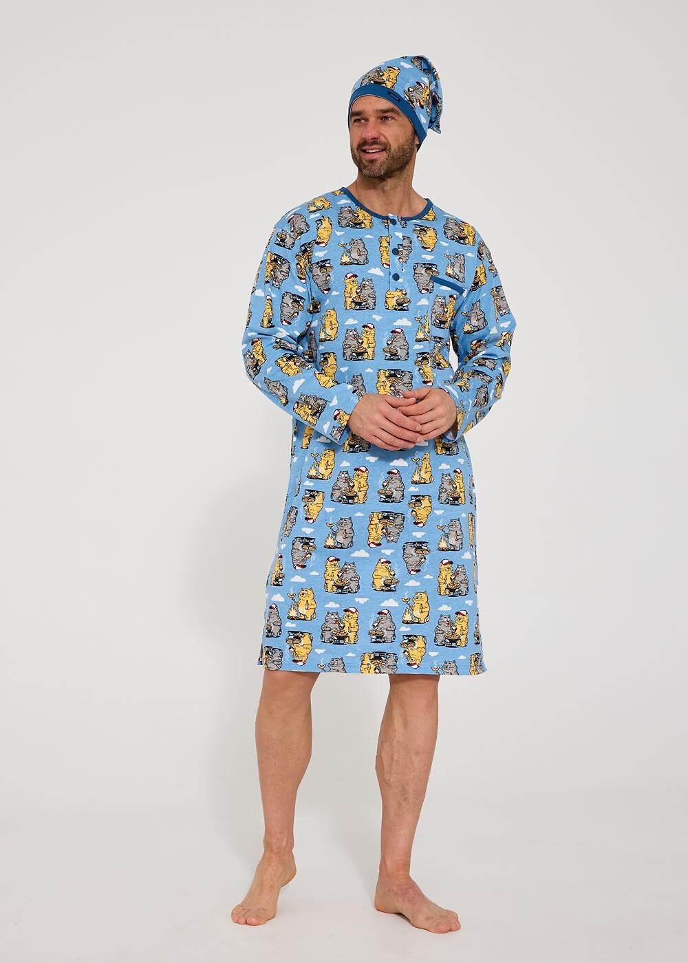 Koszula nocna, męska- bawełna z zabawnym printem- długi rękaw- dekolt zapinany na guziki- na wysokości klatki piersiowej mała kieszonka- do kompletu szlafmycaSkład: 100% bawełna
